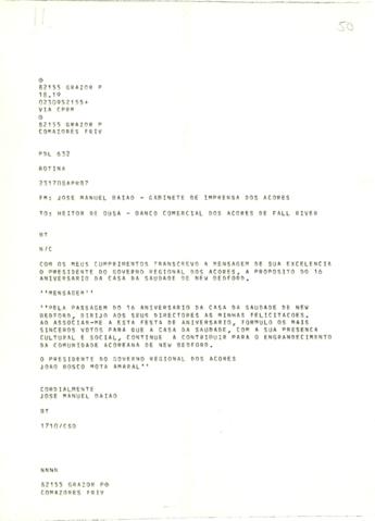 Mensagem do Presidente do Governo Regional dos Açores, a propósito do 16º aniversário da Casa da Saudade de New Bedford, para ser lida em sessão solene