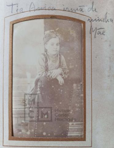 Retrato de estúdio de Margarida Pacheco aos 6 anos, sobrinha de Ana do Canto Bicudo, conforme inscrição escrita por esta no verso. No álbum, Canto da Maya escreve "Tia Anica irmã de minha mãe".