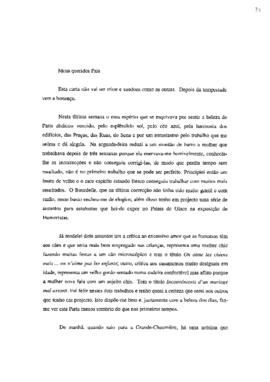 Transcrição impressa de duas cartas sem data indicada. Título atribuído. Escreve sobre os seus trabalhos e que reduziu "(...) a um montão de barro a mulher que trabalhava (...)". Começou o busto de um velho e que modelou dois assuntos. Um deles é o amor excessivo pelos cães por parte das mulheres francesas a que dou o título "On aime les chiens mais... on n'aime pas les enfants". Acrescenta que o outro assunto trabalhado é uma crítica aos casamentos entre pessoas com grande diferença de idades a que deu o título "Inconvénientes d'um mariage mal assorti". Descreve um pouco do que cada escultura representa. Continua a escrever sobre o que tem feito e visto na cidade. Na segunda carta transcrita neste documento começa por referir que vai escrever à tia [Ana do Canto Bicudo] a agradecer o presente e que tem visitado várias exposições. Com indicação de "Confidencial" pede à mãe para que não fique aflita por pensar que ele tem pouco dinheiro. É que tem dinheiro a mais porque o pai lhe mandou a mesada mais cedo, tendo assim restado 100 francos e que os porá de parte para algum imprevisto. Continua a referir às despesas.