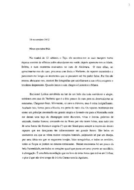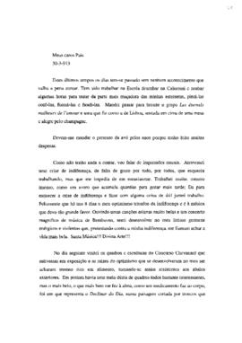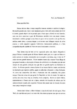 Refere que não sabe se os pais receberam o postal que informa já ter "(...) promissão para estudar na Escola de Belas-Artes. (...)", continuando a dar informações sobre algumas dificuldades. A carta continua com outros assuntos como a visita ao museu Galliera ou ao Théâtre Porte de St. Martin. Acrescenta que teve dores de cabeça e febre mas que acabou por lhe passar e que Madame Dubié o tratou como se fosse de família.