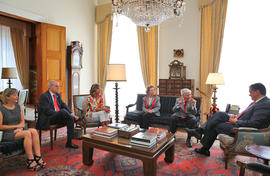 Registo fotográfico o Governador do Distrito 1960 do Rotary Club, António Mendes, acompanhado pela Ilda Braz, do Rotary Clube de Ponta Delgada Açores, em audiência, com o presidente do Governo Regional, Vasco Cordeiro, no Palácio de Sant`Ana, em Ponta Delgada.