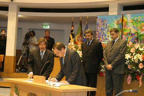 Registo fotográfico do momento da assinatura do presidente do Governo Regional, Carlos César, a seu lado o Secretário da Assembleia Legislativa da Região Autónoma dos Açores, António Loura, o Ministro da República, Juiz Conselheiro Álvaro Laborinho Lúcio e o Presidente da Assembleia Legislativa, Fernando Menezes, o Ministro da República, aquando da cerimónia da tomada de posse do IX Governo Regional.
