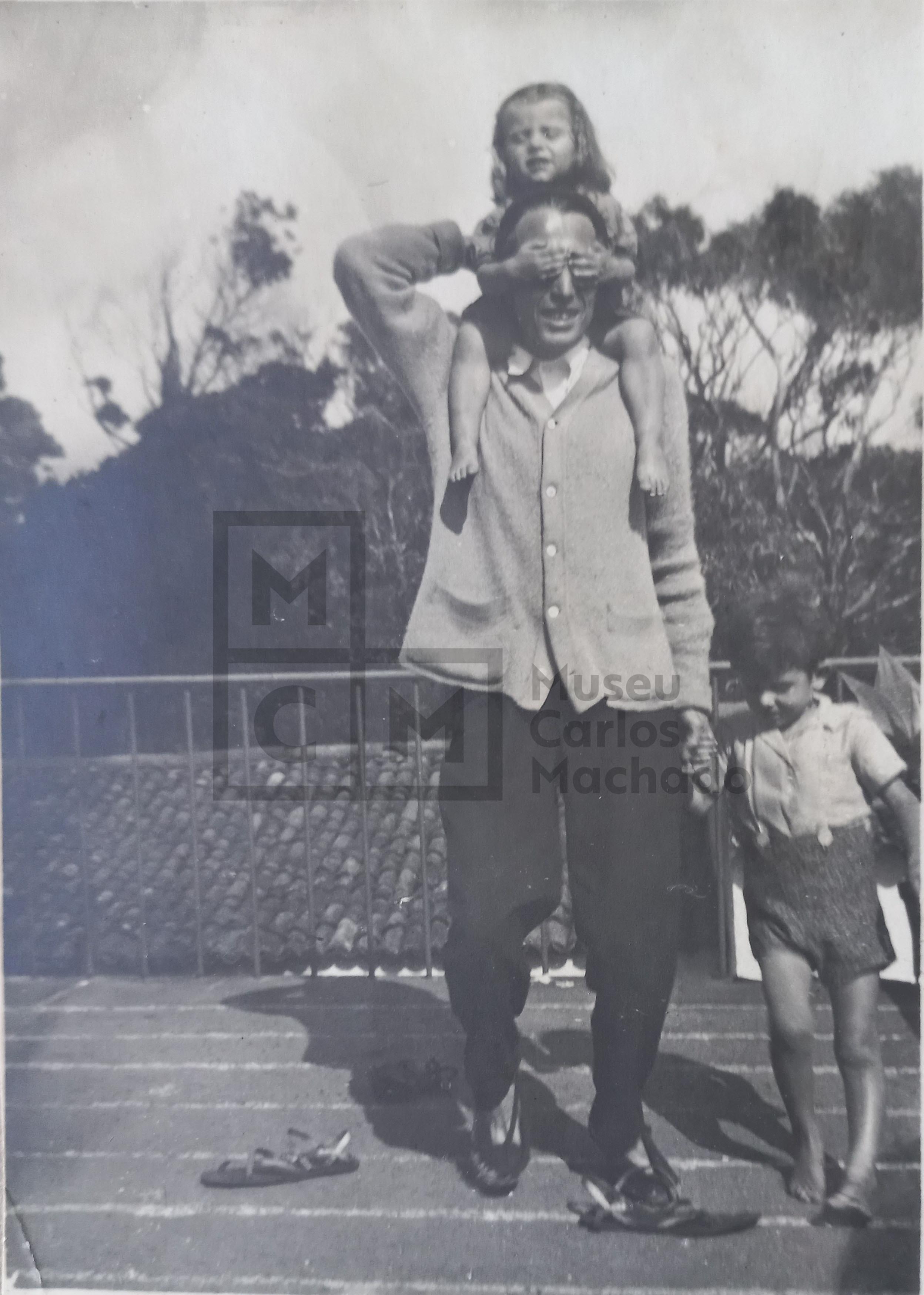Retrato no exterior de Canto da Maya com os filhos mais velhos, fruto do casamento coma 1ª mulher, Matilde Canto da Maya (1887/1960): Júlio Canto da Maya (1920/1940) e Violante Canto da Maya (n. 1923).