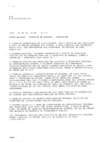 Comunicado do Conselho do Governo que se realizou em Angra do Heroísmo, a 14 de maio de 1991. O objeto digital representa a transcrição da reunião por parte do Gabinete de Imprensa dos Açores (GIA), a 15 de maio, em Ponta Delgada. Os assuntos abordados no Conselho prenderam-se com a visita de Sua Santidade o Papa, a celebração de contratos de cooperação técnico-financeira com as autarquias regionais e a aprovação de diplomas de âmbito regional.