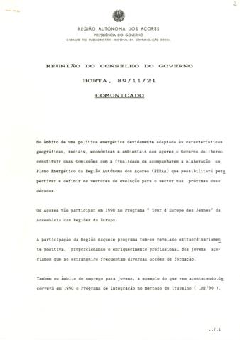 Comunicado apresentado pelo Conselho do Governo reunido em 21 de novembro de 1989, na Horta, Ilha do Faial. No qual foram abordados os diversos assuntos: o Plano Energético da Região Autónoma dos Açores (PERAA), a participação no Programa "Tour d' Europe des Jeunes", programas relacionados com aposta no setor do emprego, apoio na aquisição de viaturas para as corporações de bombeiros da Região e as diversas obras de construção nas ilhas de São Miguel e do Faial.