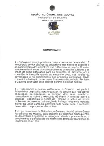 Comunicado do Conselho do Governo que se realizou em Ponta Delgada, na Ilha de São Miguel, a 18 de agosto de 1994, o qual foi emitido pelo Gabinete do Presidente. Nesta reunião o Governo analisou o balanço e andamento dos negócios públicos e ainda o cumprimento dos objetivos propostos. Debruçou-se sobre a implementação do novo Quadro Comunitário, sobre o combate ao desemprego e no apoio aos cidadãos de forma a suprir questões relacionadas com pobreza e exclusão social.