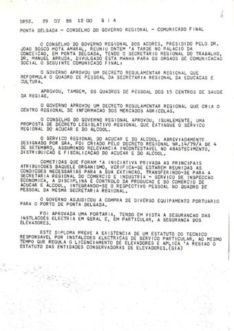 Comunicado referente ao Conselho do Governo que se realizou na Ilha de São Miguel, em Ponta Delgada, a 28 de julho de 1988. Sendo divulgado pelo Gabinete de Imprensa dos Açores - GIA no dia 29, através do Secretário Regional do Trabalho, Dr. Manuel Arruda. No mesmo foram aprovados vários diplomas regionais, no âmbito da Educação e Cultura, da Saúde e do Trabalho. E por fim, a adjudicação para compra de diverso equipamento portuário para o porto de Ponta Delgada.