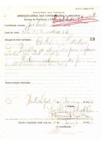 Formulário do Serviços de Divulgação e Esclarecimento da Direção Geral das Contribuições e Impostos [Ministério das Finanças] preenchido aquando da visita feita por aqueles serviços para recolha de informação no âmbito da Contribuição Industrial.