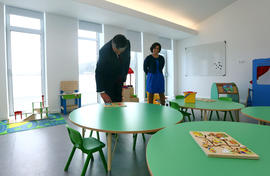 Registo fotográfico da visita do Presidente do Governo Regional, Vasco Cordeiro, e da Secretária Regional da Solidariedade Social, Andreia Martins Cardoso da Costa, a uma das salas de atividades da Creche da Casa do Povo da Maia, aquando da sua inauguração. Situada no loteamento de São Pedro, alameda do Mar, no Concelho da Ribeira Grande.