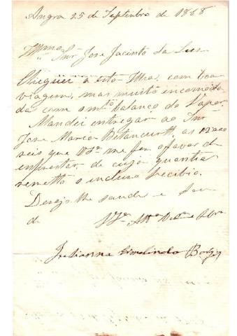 [Angra] Carta enviada por Juliana Ermelinda Borges. Escreve que entregou a José Maria Bettencourt os 12:000 reis que José Jacinto da Luz faz o favor de lhe emprestar. Acrescenta que inclui o recibo [que não consta deste arquivo].
