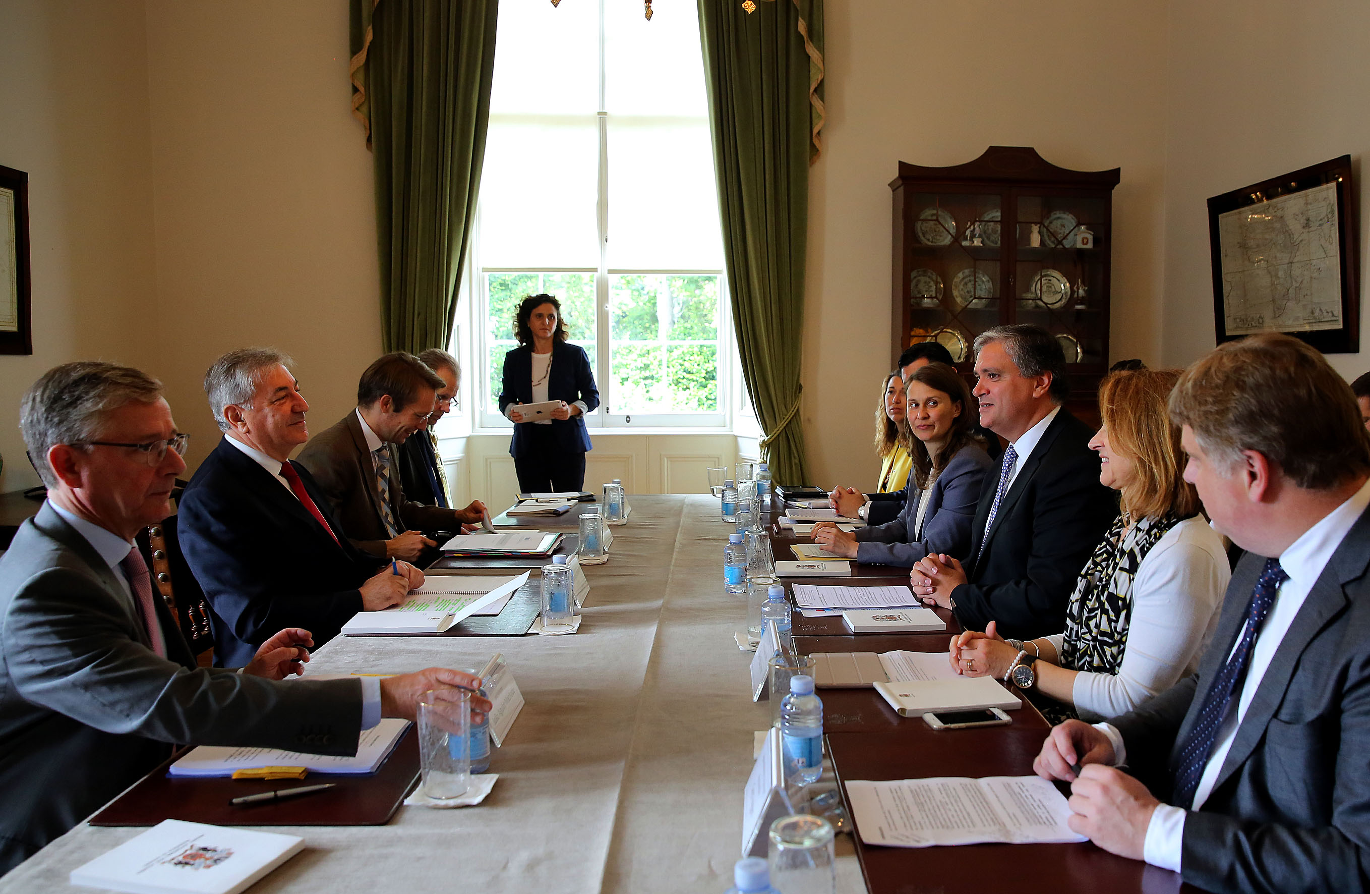 Registo fotográfico do Presidente do Governo, Vasco Cordeiro, presidindo à reunião de trabalho da Conferência das Regiões Periféricas e Marítimas da Europa (CRPM) com o Comissário Europeu para o Ambiente, Assuntos Marítimos e Pescas, Karmenu Vella,no Palácio de Santana, em Ponta Delgada.
