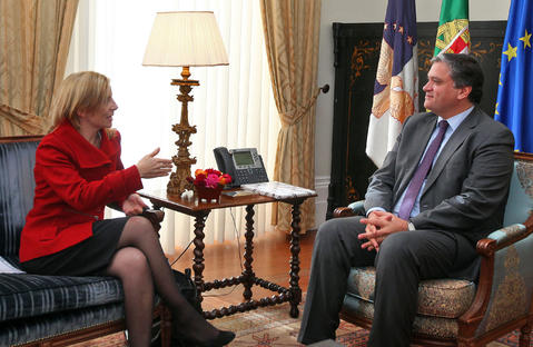 Registo fotográfico da Embaixadora do Canadá, Heidi Kutz, em audiência, com o Presidente do Governo Regional, Vasco Cordeiro, no Palácio de Santana, em Ponta Delgada.