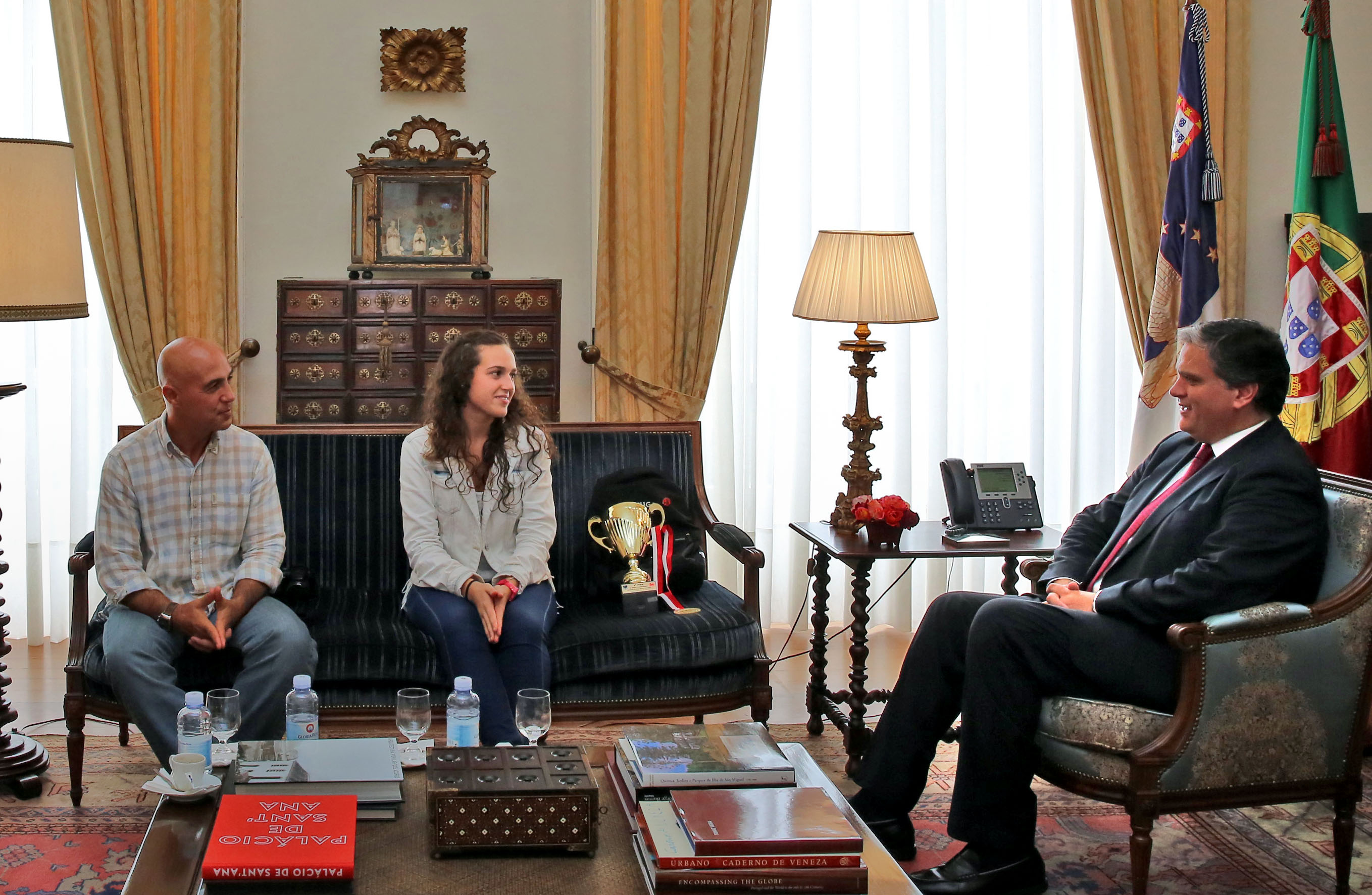 Registo fotográfico da atleta do Shotokan Dojo Clube de Ponta Delgada, Carolina Bento, acompanhada pelo treinador Fernando Vicente, em audiência, com o presidente do Governo Regional, Vasco Cordeiro, no Palácio de Santana, em Ponta Delgada.