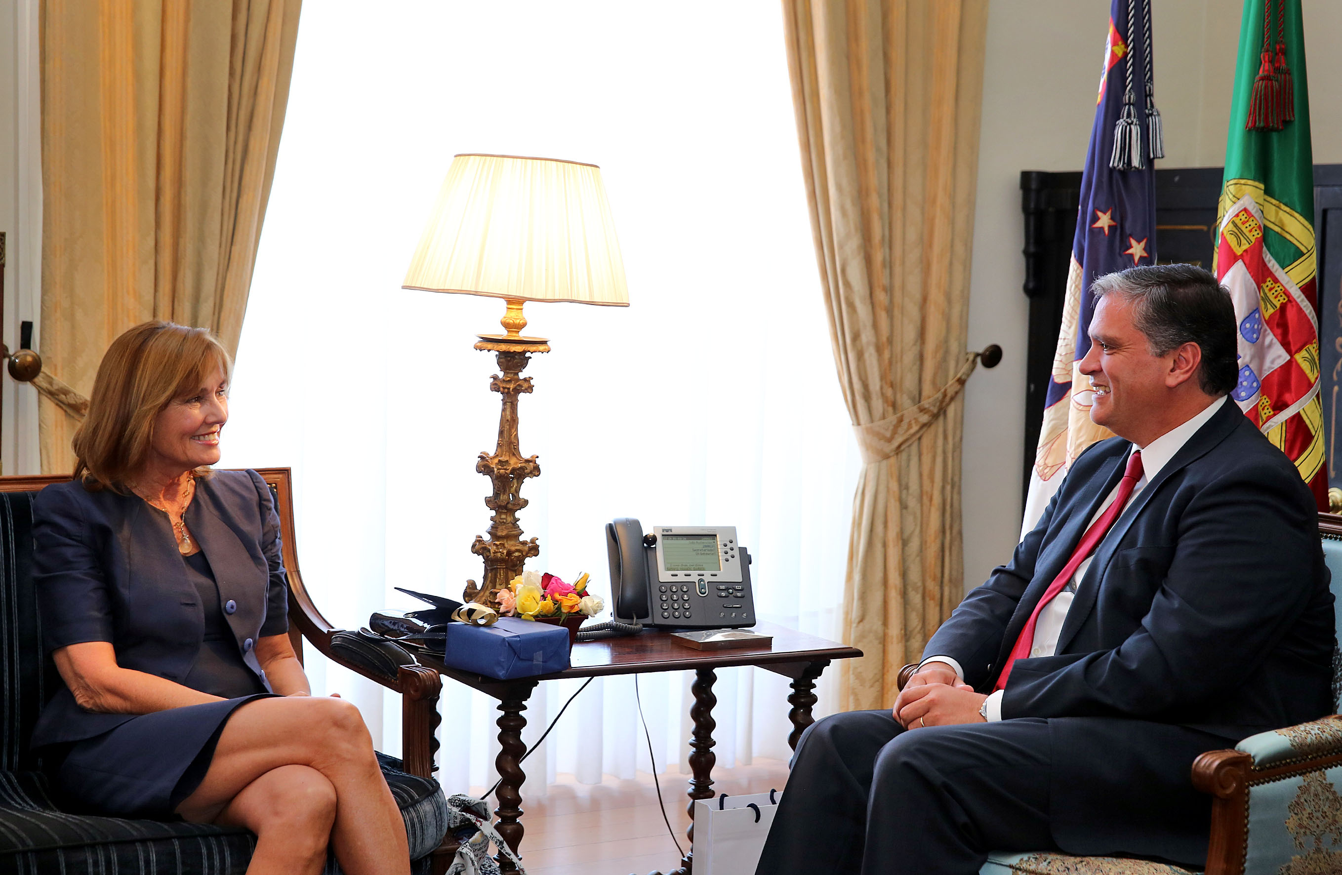 Registo fotográfico a Embaixadora da Suécia, Caroline Fleetwood, em audiência, com o presidente do Governo Regional, Vasco Cordeiro, no Palácio de Sant`Ana, em Ponta Delgada.