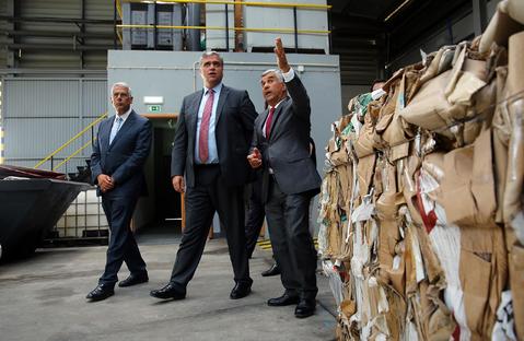 Registo fotográfico do Álvaro Rodrigues, Sócio Gerente da Serralharia do Outeiro, acompanhando o Presidente do Governo Regional, Vasco Cordeiro e o Secretário Regional da Agricultura e Ambiente, Luís Nuno Ponte Neto de Viveiros, na visita à Unidade de Tratamento de Resíduos da empresa Serralharia do Outeiro - Recicloambi na Freguesia do Pico da Pedra, Concelho da Ribeira Grande.