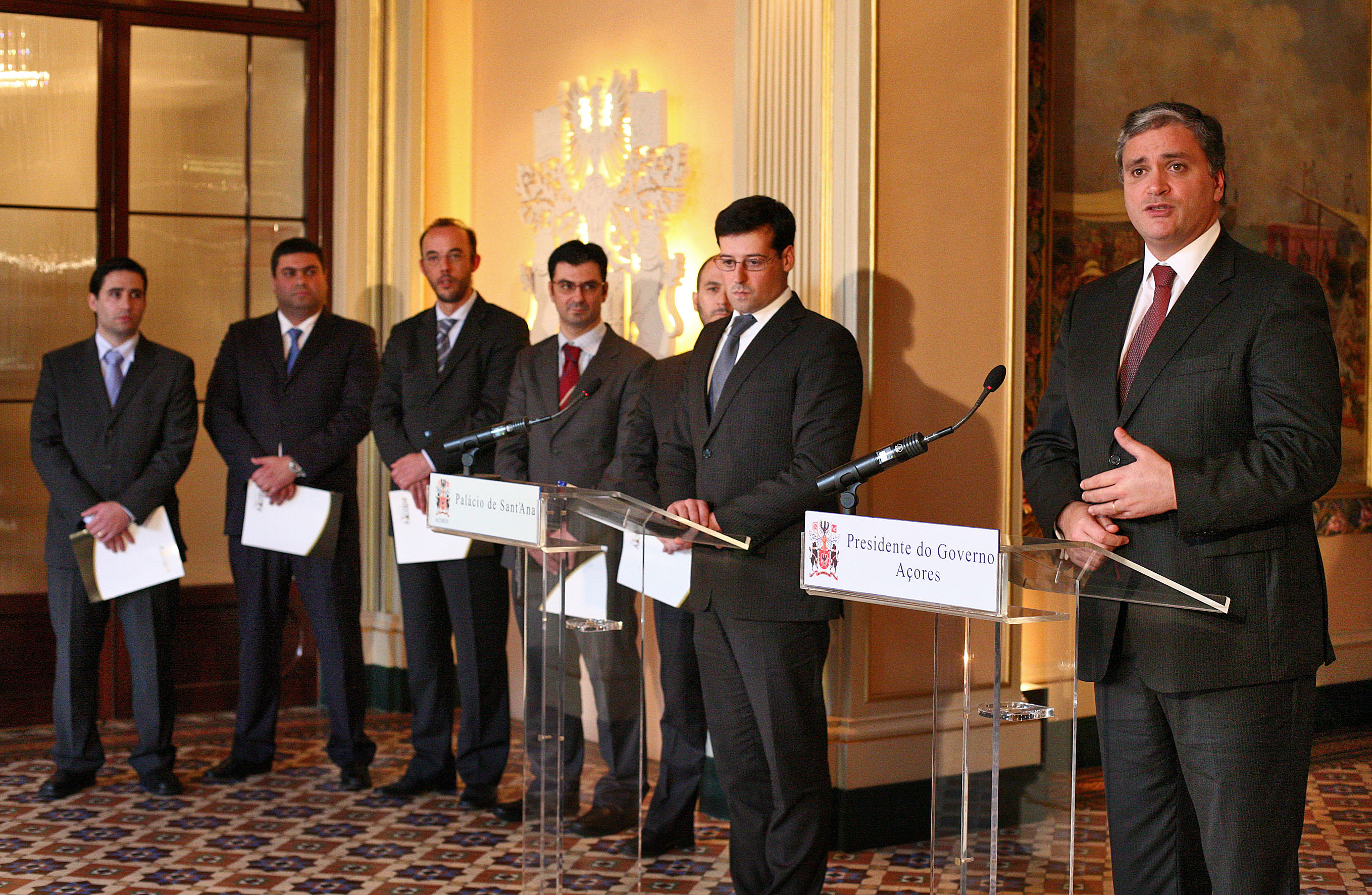 Registo fotográfico do Presidente do Governo Regional, Vasco Cordeiro, e dos dirigentes da Associação dos Industriais de Construção Civil e Obras Públicas dos Açores (AICOPA), em declarações aos órgãos de Comunicação Social, após audiência, no Palácio de Santana, em Ponta Delgada.