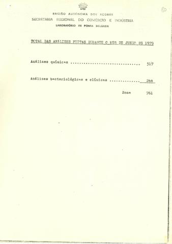 Notícia divulgada junto dos OCS, relacionada com o total das análises feitas durante o mês de junho de 1979, por parte do Laboratório de Ponta Delgada. Compreende análises químicas, bacteriológicas e clínicas.