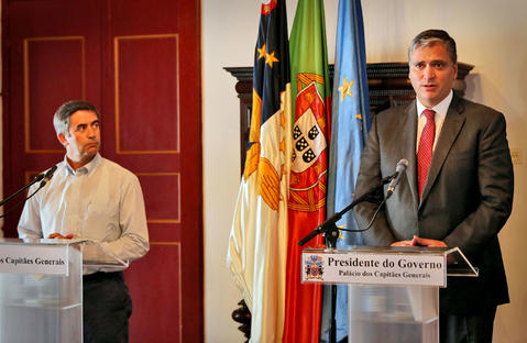 Registo fotográfico do presidente do Governo Regional, Vasco Cordeiro, e o representante da Comissão Representativa dos Trabalhadores Portugueses na Base das Lajes, em declarações aos órgãos de comunicação social, após audiência no Palácio dos Capitães Generais, em Angra do Heroísmo.