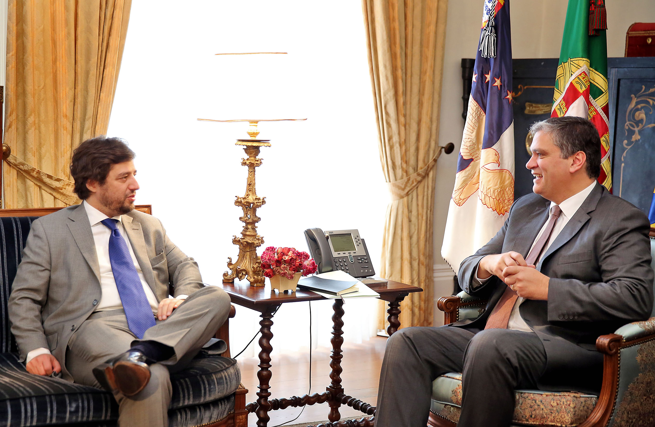 Registo fotográfico do Ministro Adjunto e do Desenvolvimento Regional, Miguel Poiares Maduro, em audiência, com o presidente do Governo Regional, Vasco Cordeiro, no Palácio de Santana, em Ponta Delgada.