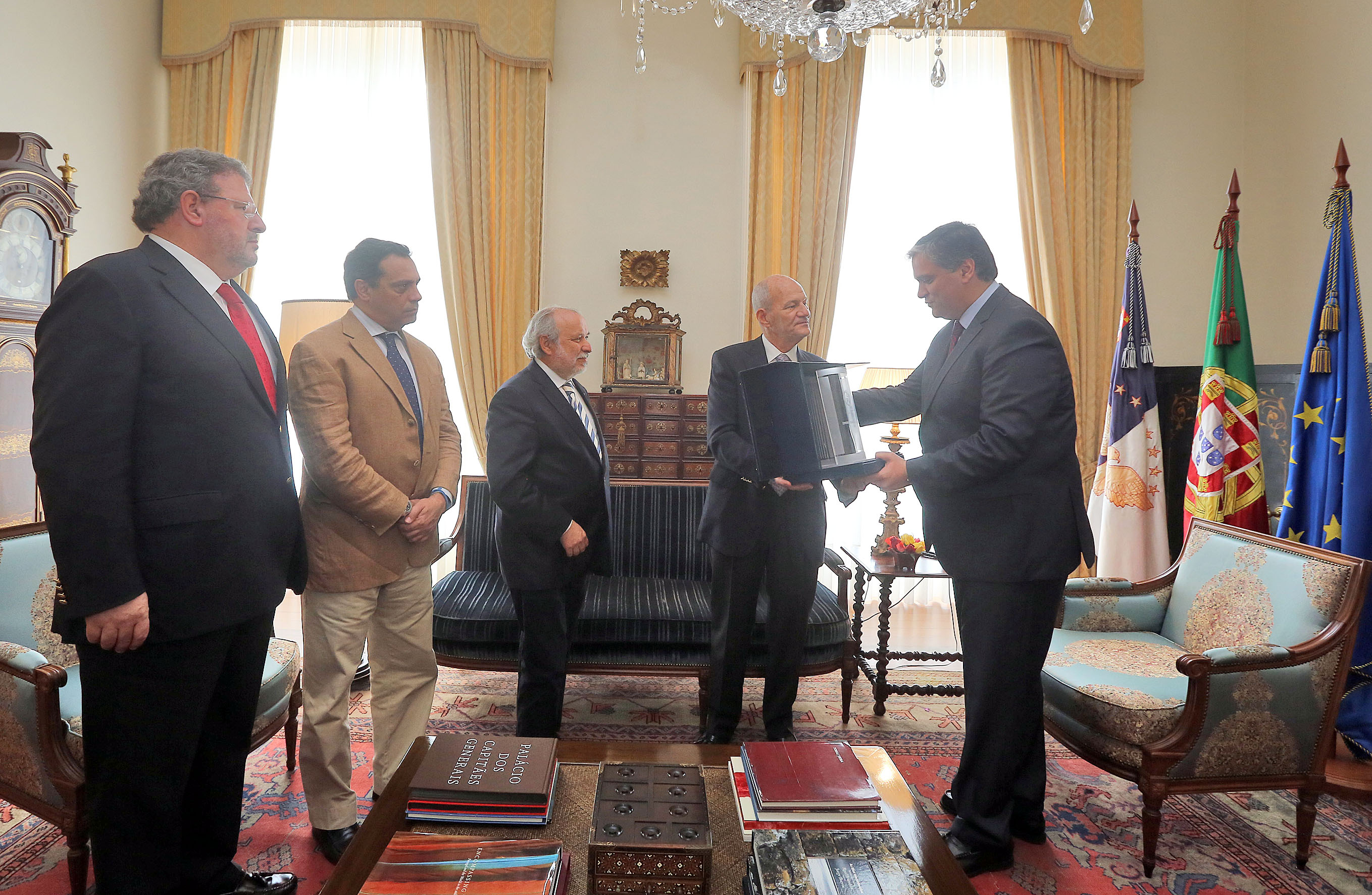 Registo fotográfico do presidente da Federação Portuguesa de Automobilismo e Karting (FPAK), Manuel Breyner, oferecendo ao presidente do Governo o prémio César Torres, no Palácio de Sant`Ana, em Ponta Delgada.