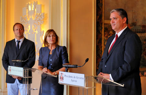 Registo fotográfico do presidente do Governo Regional, Vasco Cordeiro, e da Embaixadora da Suécia, Caroline Fleetwood, em declarações aos órgãos de comunicação social, após audiência, no Palácio de Santana, em Ponta Delgada.