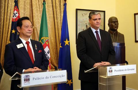 O presidente do Governo Regional e O Vice-Presidente da Associação Internacional de Lions Clubes, Jitsuhiro Yamada, em declarações aos órgãos de comunicação social
