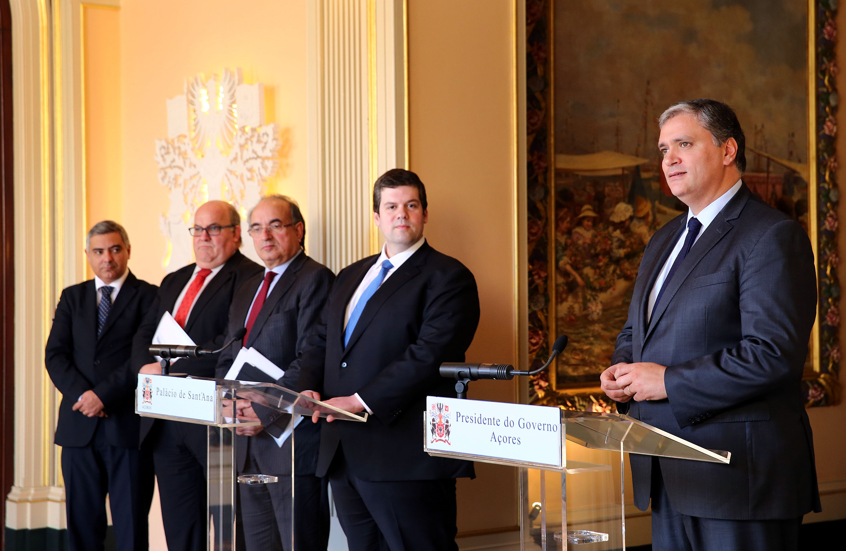 Registo fotográfico do presidente do Governo Regional, Vasco Cordeiro, e do presidente da Associação Nacional de Freguesias (ANAFRE), Pedro Cegonho, em declarações aos órgãos de comunicação social, após audiência, no Palácio de Santana, em Ponta Delgada.