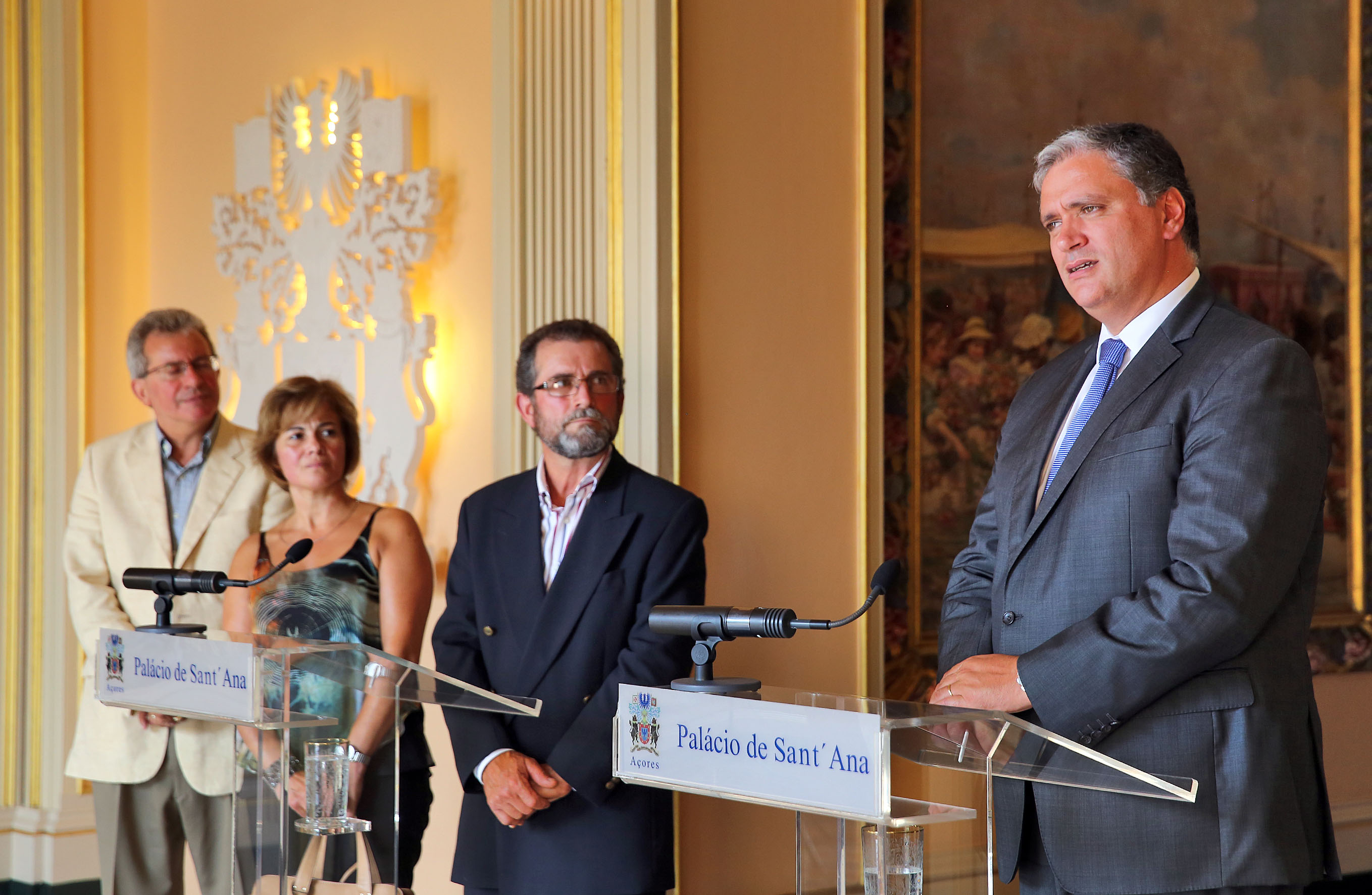 Registo fotográfico do presidente do Governo Regional, Vasco Cordeiro, e da direção da Associação de Emigrantes dos Açores, em declarações aos órgãos de comunicação social, após audiência, no Palácio de Santana, em Ponta Delgada.