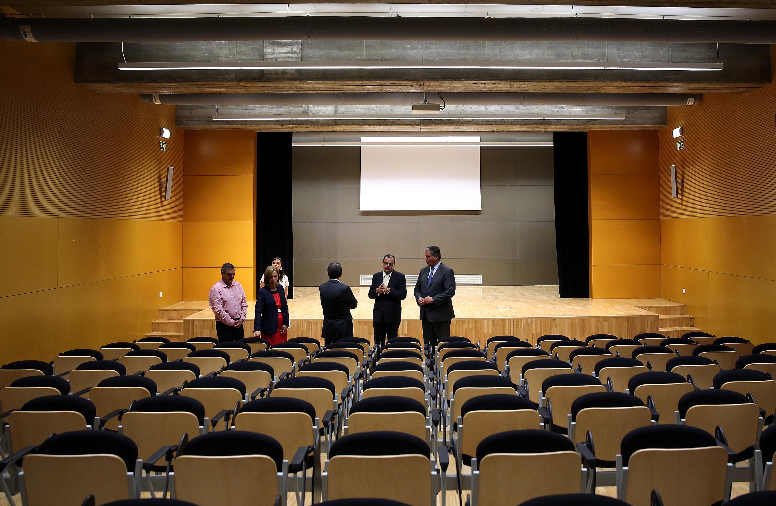 Registo fotográfico do Presidente do Governo Regional, Vasco Cordeiro e o Secretário Regional da Educação e Cultura, Avelino de Freitas de Meneses, com os elementos do conselho executivo na visita ao auditório da Escola Básica e Secundária das Velas, aquando da inauguração das obras de reparação e adaptação da Escola Básica e Secundária das Velas.
