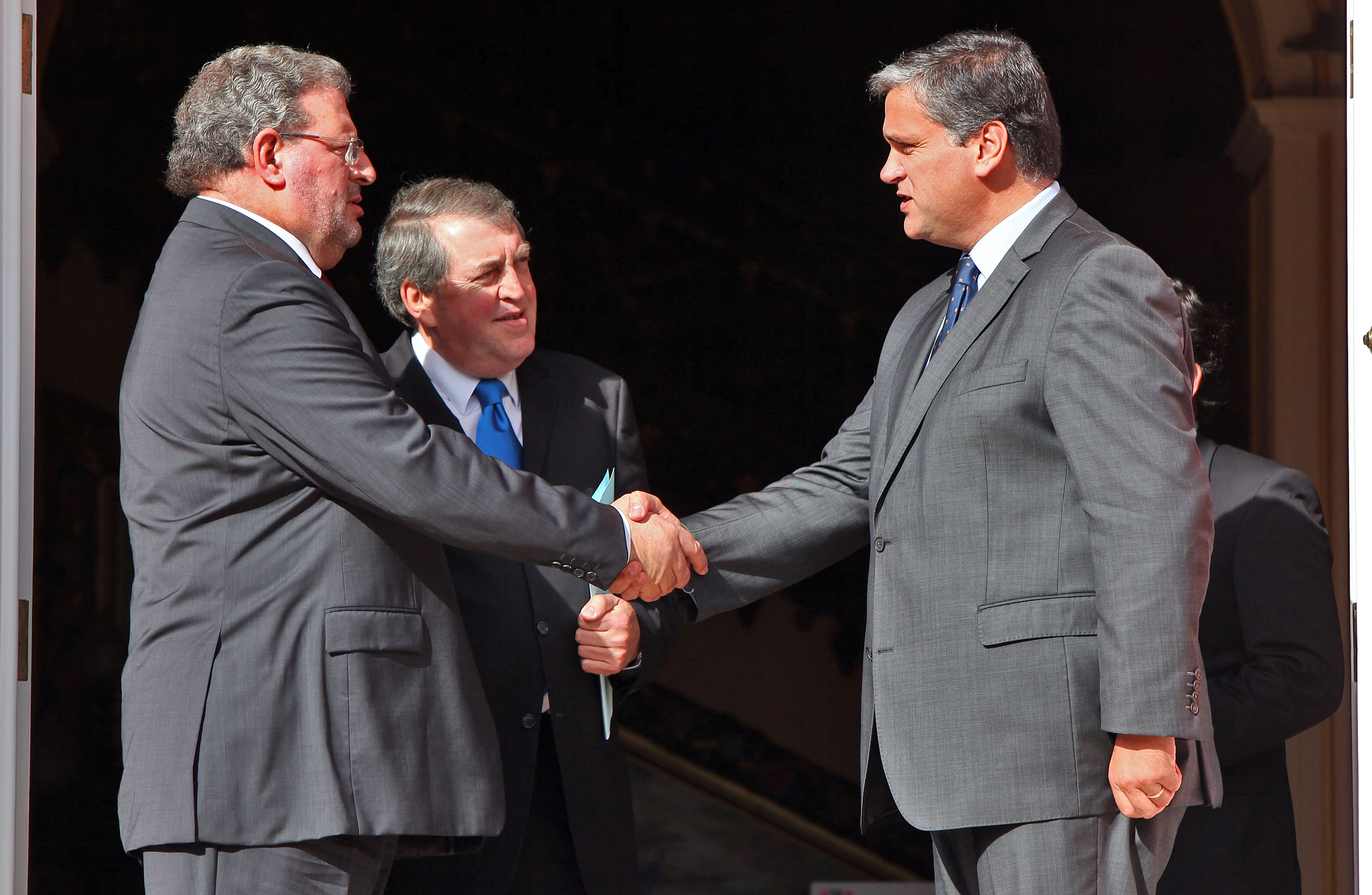 O presidente do Grupo Desportivo Comercial despede-se do presidente do Governo Regional após audiência, no Palácio de Sant`Ana