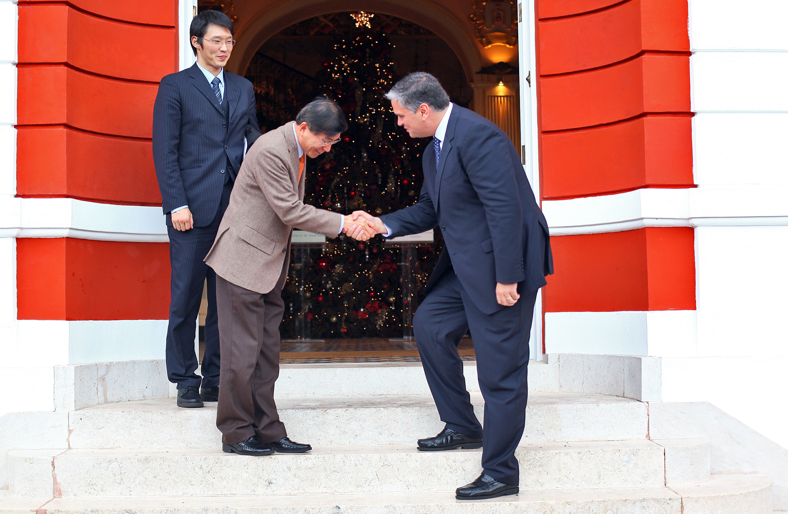 Registo fotográfico do Embaixador da República da Coreia, em Lisboa, Jung-hee Yoo, despedindo-se do Presidente do Governo Regional, Vasco Cordeiro, à saída do Palácio de Sant`Ana, após a audiência.