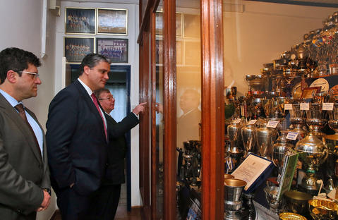 João Tomé, Presidente do Clube Desportivo, mostra os troféus do Clube, ao Presidente do Governo Regional dos Açores