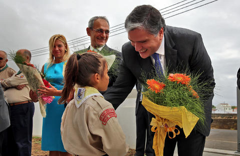 Registo fotográfico do Presidente do Governo Regional dos Açores, Vasco Cordeiro, na inauguração do Centro de Formação do Belo Jardim, na Praia da Vitória, recebendo um ramo de flores oferecido ao Presidente do Governo Regional, por um elemento do do Corpo Nacional de Escutas (CNE), da Região dos Açores.