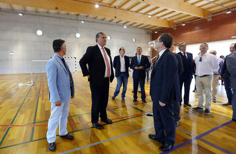 Registo fotográfico do Presidente do Governo Regional, Vasco Cordeiro, visitando o ginásio das novas instalações da Escola Básica Integrada Gaspar Frutuoso, aquando da sua inauguração, na Ribeira Grande. Acompanhá-lo nesta visita, estive, o Secretário Regional da Educação e Cultura, Avelino de Freitas de Meneses, e o Conselho Executivo da escola básica/integrada Gaspar Frutuoso.