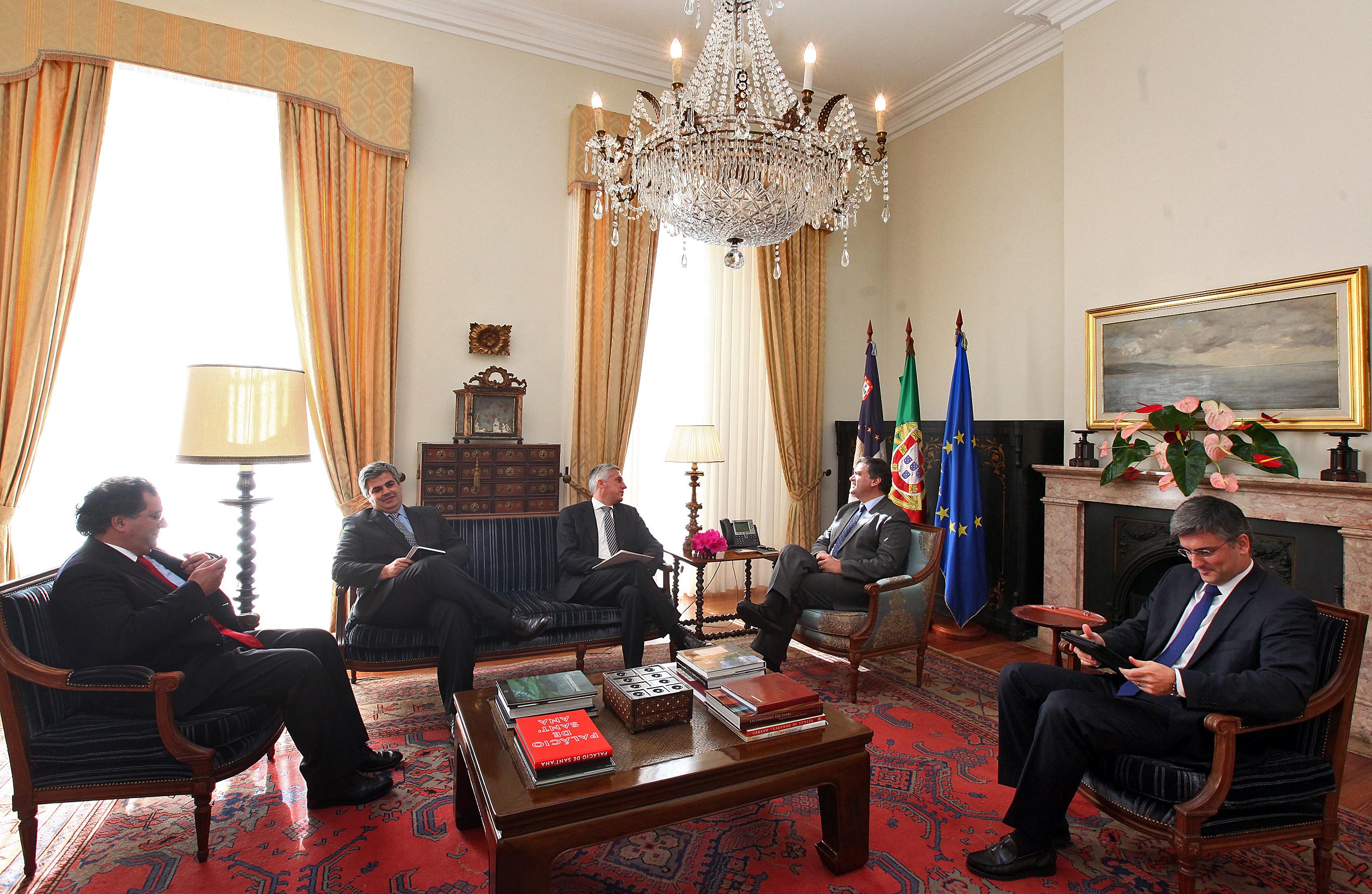 Registo fotográfico do líder do PSD/Açores, Duarte Freitas, e o parlamentar Luís Maurício, em reunião com o Presidente do Governo Regional, Vasco Cordeiro, no Palácio de Santana, em Ponta Delgada. O presidente do Governo Regional reuniu-se com os Partidos Políticos, para recolha de contributos para o - Compromisso para a Sustentabilidade do Serviço Regional de Saúde.