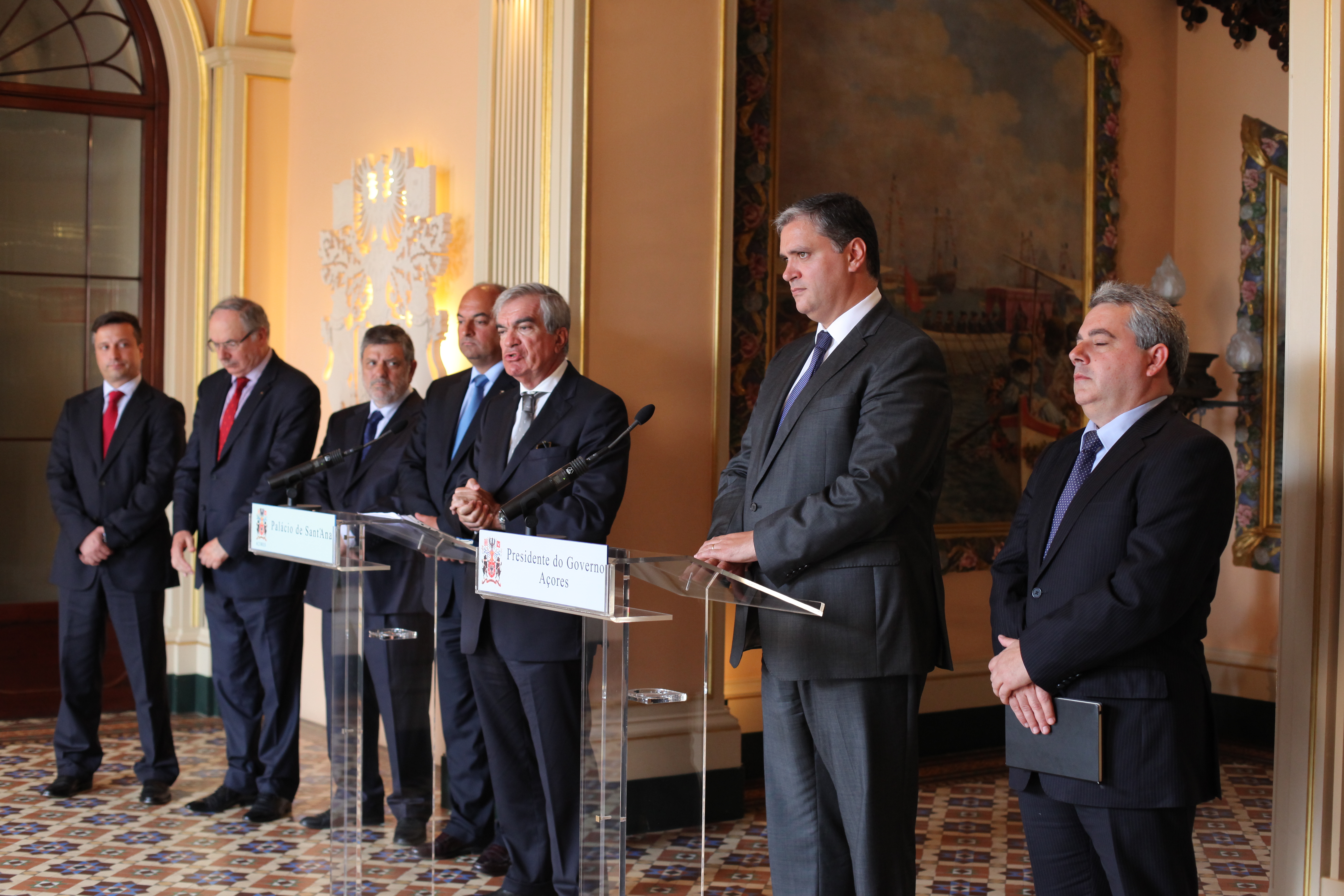 Registo fotográfico do presidente do Governo Regional, Vasco Cordeiro, e do Luís Mira Amaral, presidente da Comissão Executiva do Banco BIC, em declarações aos órgãos de comunicação social, após audiência no Palácio de Santana, em Ponta Delgada.