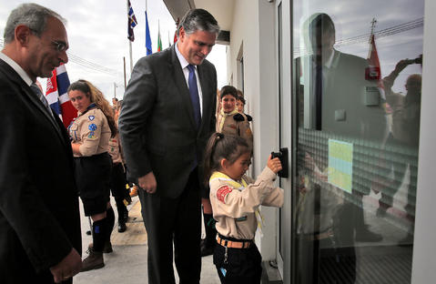 Registo fotográfico do Presidente do Governo Regional dos Açores, Vasco Cordeiro, acompanhado pelo Secretário Regional da Educação, Ciência e Cultura, Luiz Manuel Fagundes Duarte, na abertura do edifício do Centro de Formação do Belo Jardim, na Praia da Vitória, por uma criança pertencente ao Corpo Nacional de Escutas (CNE), da Região dos Açores.