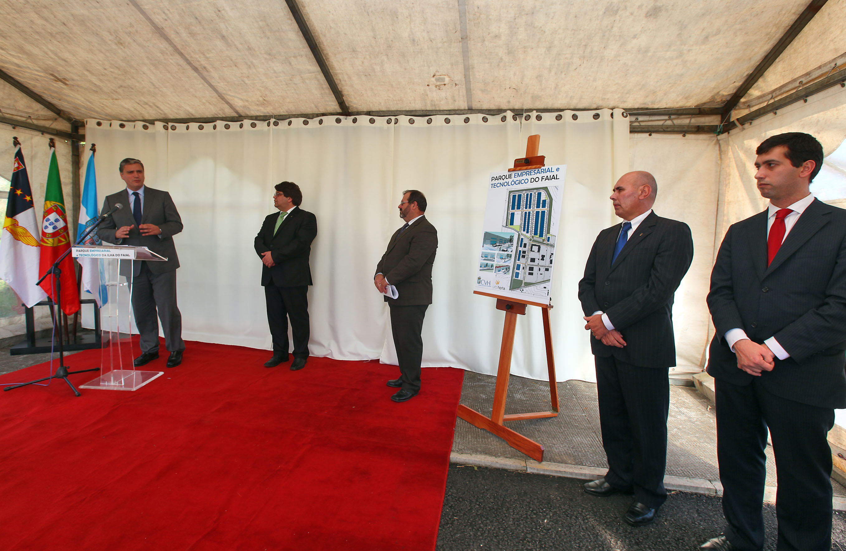 Registo fotográfico do Presidente do Governo, Vasco Cordeiro, presidiu à cerimónia do Parque Empresarial e Tecnológico da Faial, esteve igualmente presente, o Presidente da Camara Municipal da Horta, João Fernando Brum de Azevedo e Castro, na zona industrial de Santa Bárbara, Freguesia de Angústias, Concelho de Horta.