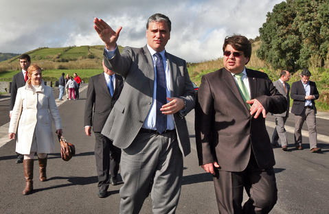 Registo fotográfico do Presidente do Governo, Vasco Cordeiro, acompanhado com o Presidente da Câmara Municipal da Horta, João Fernando Brum de Azevedo e Castro, na visita à área exterior do Parque Empresarial e Tecnológico da Horta, na zona industrial de Santa Bárbara, Freguesia de Angústias, Concelho de Horta.