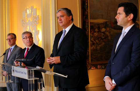 Registo fotográfico do Presidente do Governo, Vasco Cordeiro, acompanhado pelo Subsecretário Regional da Presidência para as Relações Externas, Rodrigo Oliveira, e pelo Comissário Europeu para o Ambiente, Assuntos Marítimos e Pescas, Karmenu Vella, em declarações para os meios de comunicação social, no Palácio de Sant`Ana em Ponta Delgada.