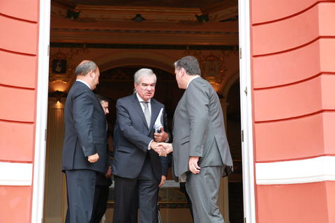 Registo fotográfico do Luís Mira Amaral, presidente da Comissão Executiva do Banco BIC, despedindo-se do Presidente do Governo Regional, após a audiência no Palácio de Sant`Ana, em Ponta Delgada.