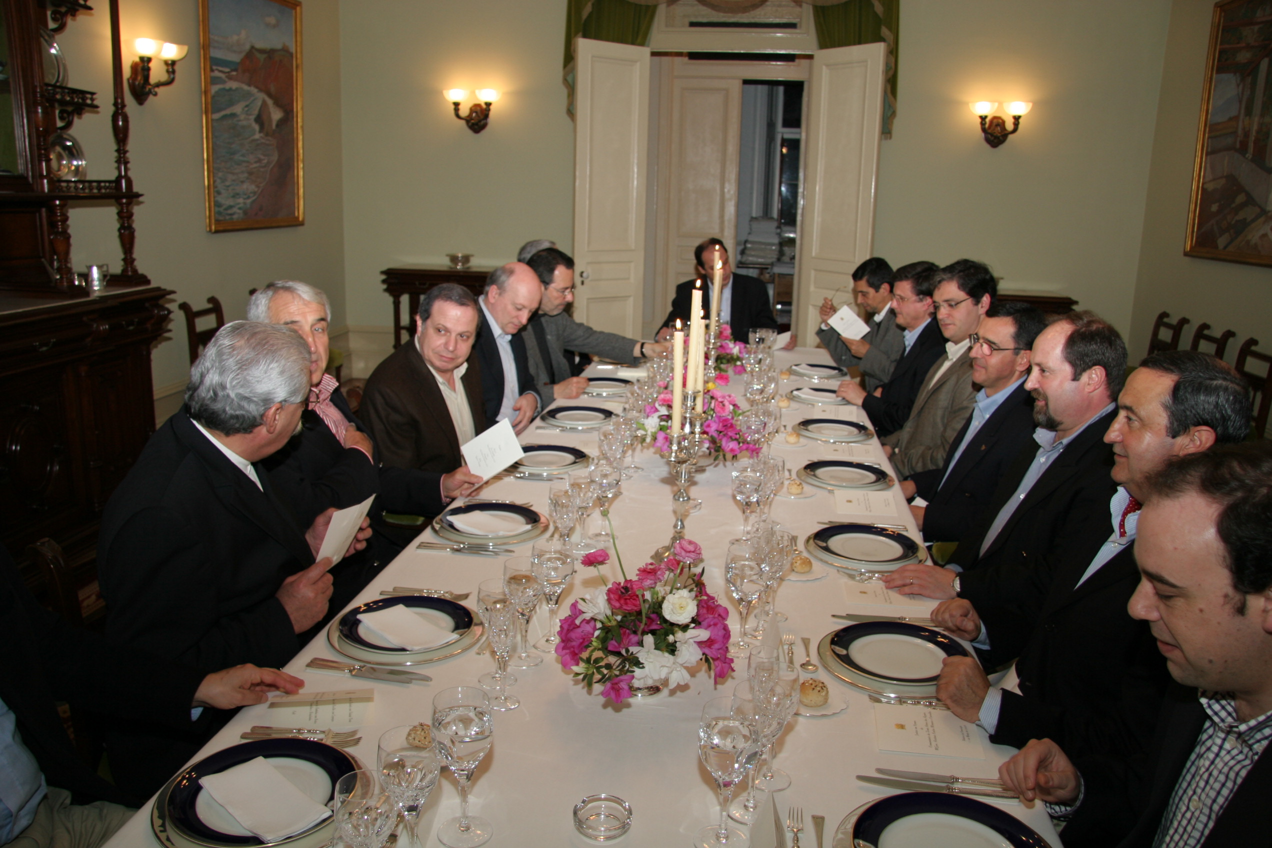Registo fotográfico do jantar de cortesia ao comandante cessante da Zona Aérea dos Açores, Major-General, Mimoso e Carvalho, oferecido pelo presidente do Governo Regional, Carlos César, no Palácio da Conceição em Ponta Delgada. Estiveram presentes vários secretários regionais e o chefe de Gabinete, Luís Soares.