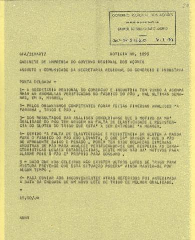 Comunicado da Secretaria Regional do Comércio e Indústria sobre o acompanhamento desta secretaria às análises efetuadas no processo de fabrico do pão, no sentido de entender a falta de qualidade e anomalias existentes no pão produzido na Ilha de São Miguel.
