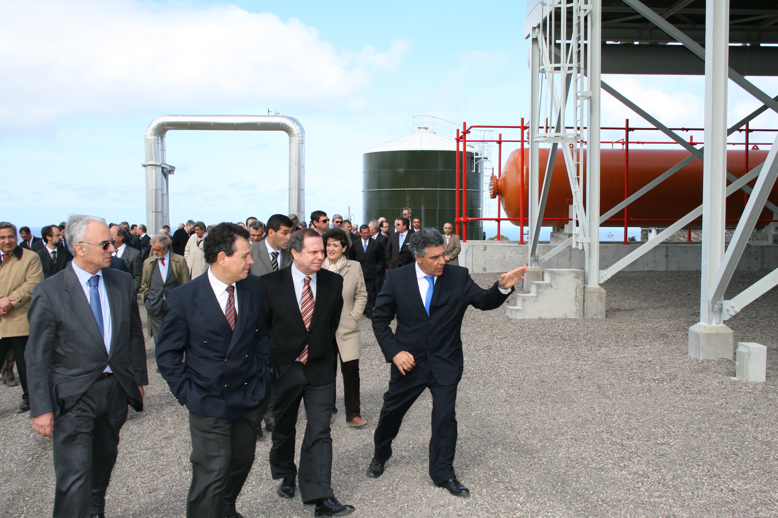 Registo fotográfico do presidente do Governo Regional, o presidente da EDA, Roberto de Sousa Rocha Amaral, o Secretário Regional da Economia, Duarte José Botelho da Ponte e vários elementos da empresa EDA e do governo, na visita ao exterior do parque da nova Central Geotérmica do Pico Vermelho.