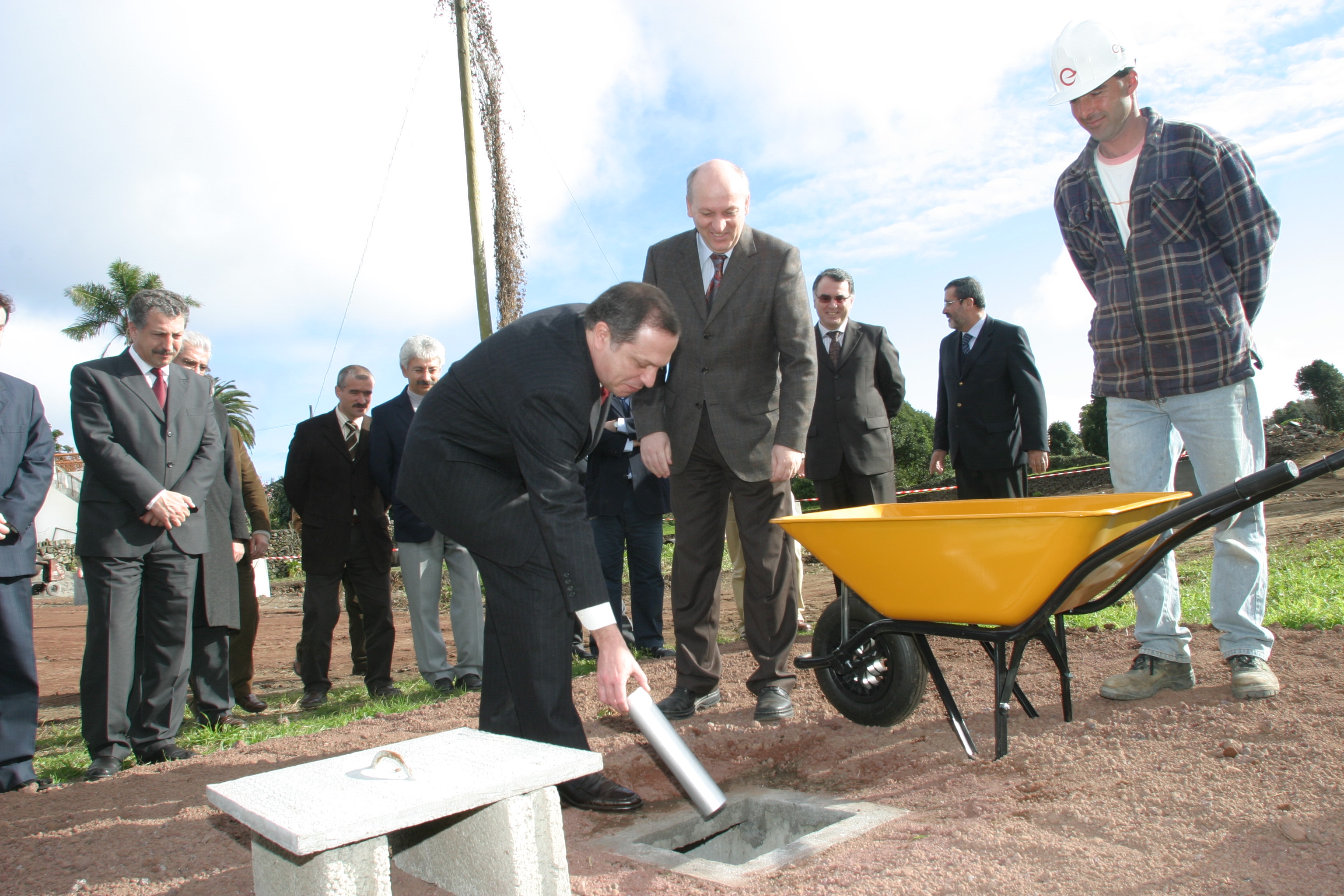 Registo do momento da colocação da "cápsula do tempo" pelo presidente do Governo Regional, Carlos César, para ato simbólico de colocação da mesma juntamente com a primeira pedra da Escola Básica e Secundária Tomás de Borba, em Angra do Heroísmo, ilha Terceira.