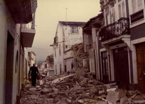 Danos provocados pelo sismo de 1 de janeiro de 1980, em alguns dos edifícios na freguesia da Sé em Angra do Heroísmo. Aspeto geral da destruição provocada pelo sismo.