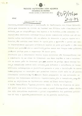 O referido processo contém diversos ofícios, enviados de diferentes entidades, ao Presidente do Governo Regional dos Açores, cujo assunto de refere aos acontecimentos verificados em Ponta Delgada, aquando do hasteamento da bandeira da Autonomia nas Festa dos Senhor Santo Cristo. Juntamente com os respetivos ofícios seguem os seguintes documentos: cópia autenticada de parte da ata da reunião da Assembleia Municipal de Ponta Delgada, cópia do comunicado do Diretório do Partido Popular Monárquico, cópia de parte da ata da reunião da Câmara Municipal de Angra do Heroísmo, cópia autêntica de parte da ata da reunião ordinária da Câmara Municipal de Ponta Delgada. O processo contém ainda o ofício da Câmara Municipal da Ribeira Grande e uma fatura do internamento de Ninalmon Sousa Paulino no Hospital Distrital de Ponta Delgada.