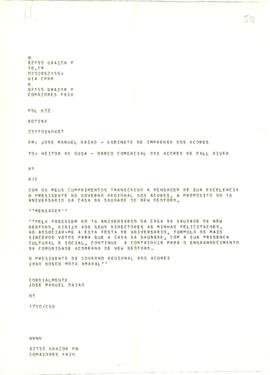 Este processo contém documentação referente ao Almoço oferecido pelo Presidente do Governo Regional dos Açores, Mota Amaral em honra do Congressista Norte-Americano Barney Frank, na "Casa de Chá" do "Hotel Terra Nostra", na Lagoa das Furnas. Contém lista de convidados, telex com noticia sobre a vinda do congressista à Região, telex de representante do escritório do congressista "Comercial dos Azores, Inc" a pedir marcação de quartos e manuscritos com ementa do almoço.
