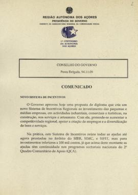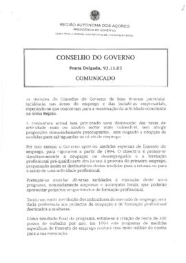 Comunicado do Conselho do Governo que se realizou em Angra do Heroísmo, Ilha Terceira, a 24 de janeiro de 1994, o qual foi emitido pelo Gabinete do Subsecretário Regional da Comunicação Social. As decisões tratadas pelo Governo incidiram sobre a definição de uma nova política aérea regional, sobre diploma que cria a administração dos Portos dos Açores, adjudicação de empreitada de construção, e por último, a criação do fundo açoriano de seguros agrícolas.