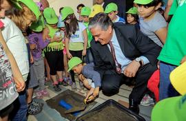 Registo fotográfico do Presidente do Governo, Vasco Cordeiro, colocando a cápsula do tempo, em conjunto com as crianças, na cerimónia de lançamento da Primeira Pedra da obra de requalificação do edifício da creche - O Castelinho, rua Cônsul Dabney, na Horta.